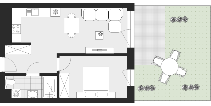 - Charakterystyka mieszkania: 42,20 m², 2 pokoje, 1 łazienka; stan: deweloperski